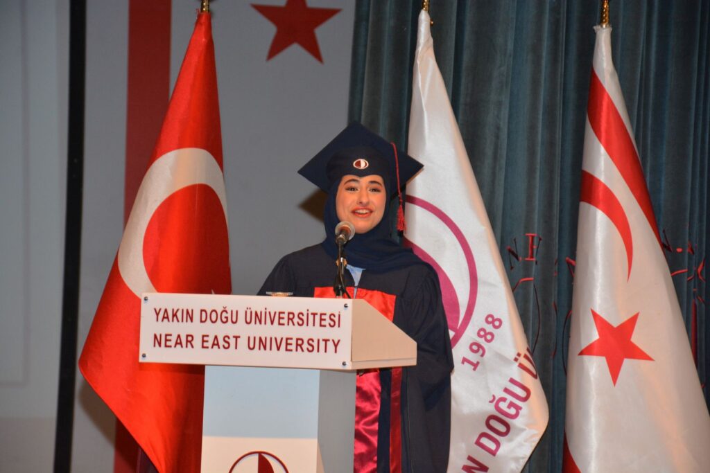 Saygı duruşu ve İstiklal Marşı’nın okunmasıyla başlayan törende, Yakın Doğu Üniversitesi Rektör Yardımcısı Doç. Dr. Murat Tüzünkan ve Yakın Doğu Üniversitesi Eczacılık Fakültesi Dekanı Prof. Dr. İhsan Çalış birer konuşma yaptı. Mezun olan tüm öğrenciler adına ise fakülte birincisi Tabarek Thamer Shah duygularını paylaştı.