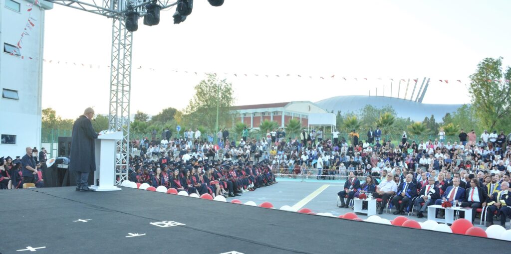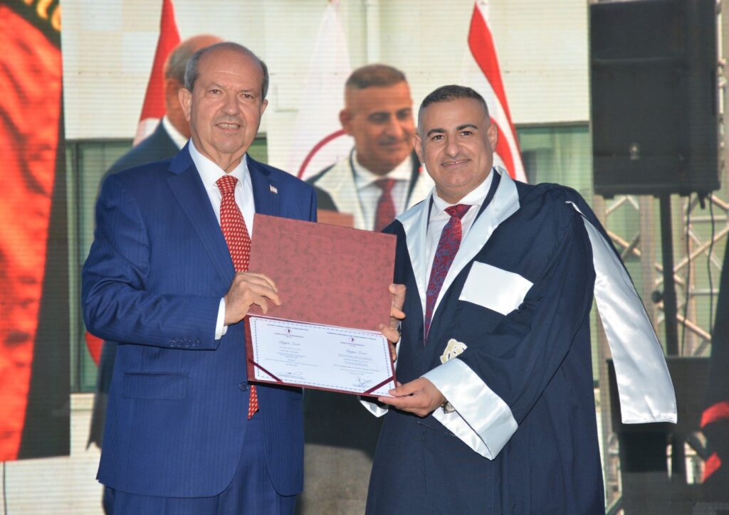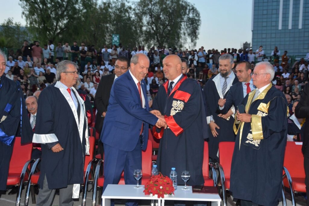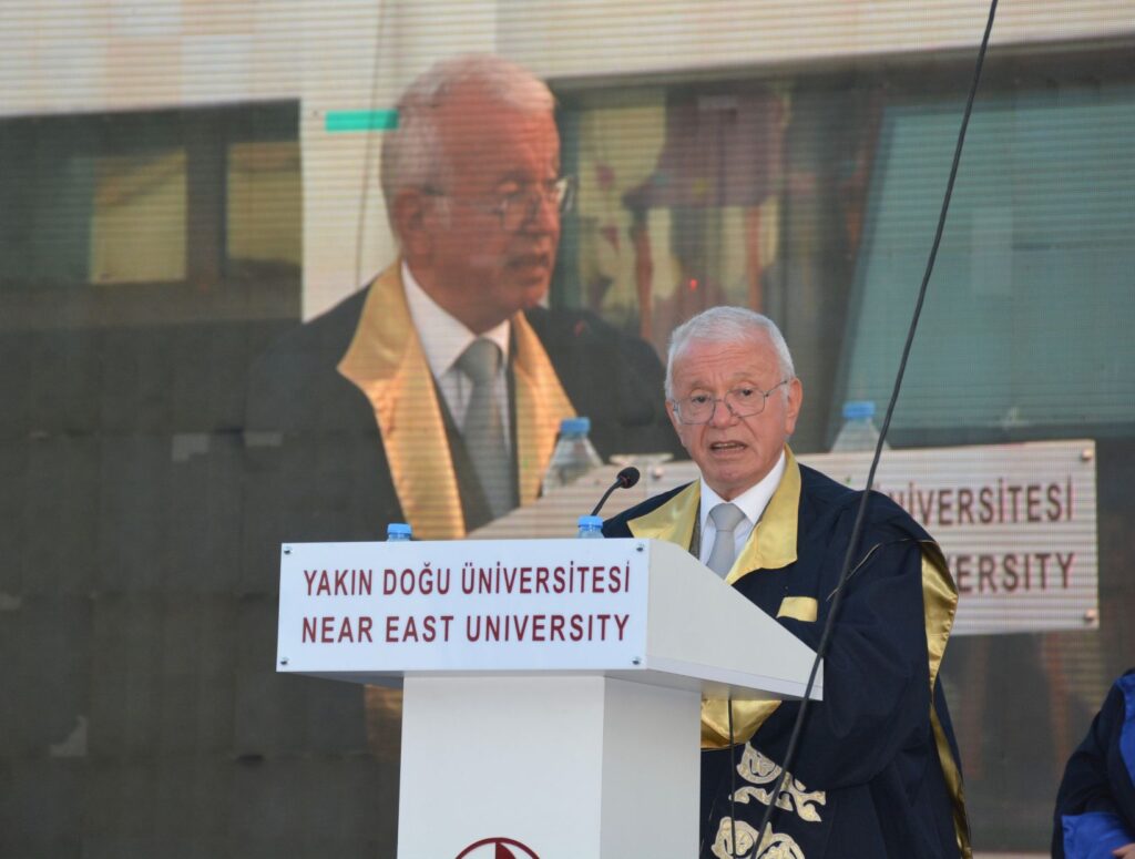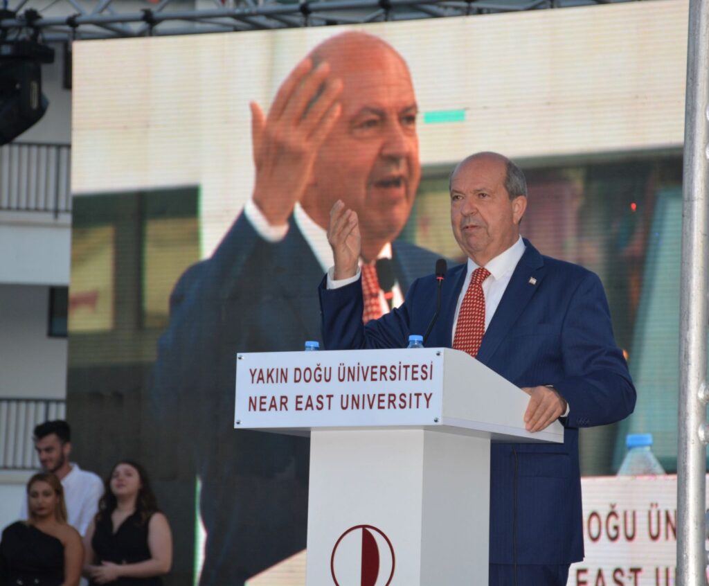 Cumhurbaşkanı Ersin Tatar Yakın Doğu Üniversitesi mezunlarını kutlayarak başladığı konuşmasını “Artık yeni bir dönemin başlangıcındasınız, elde ettiğiniz deneyimler ve tecrübelerle yeni hayatınıza hazırsınız” sözleri ile devam etti. Cumhurbaşkanı Tatar, aynı zamanda Yakın Doğu Üniversitesi Lisansüstü Eğitim Enstitüsü mezunlarından Cumhurbaşkanlığı Özel Kalem Müdürü Çağın Zort’u da tebrik etti. “Çağın Zort sayesinde gördüm ki, doktora yapmak zor bir iş. Sıkı çalışmak ve sürekli yaratıp üretmek lazım. Ve sizler bugün bu zorlu yolu tamamladınız” dedi.