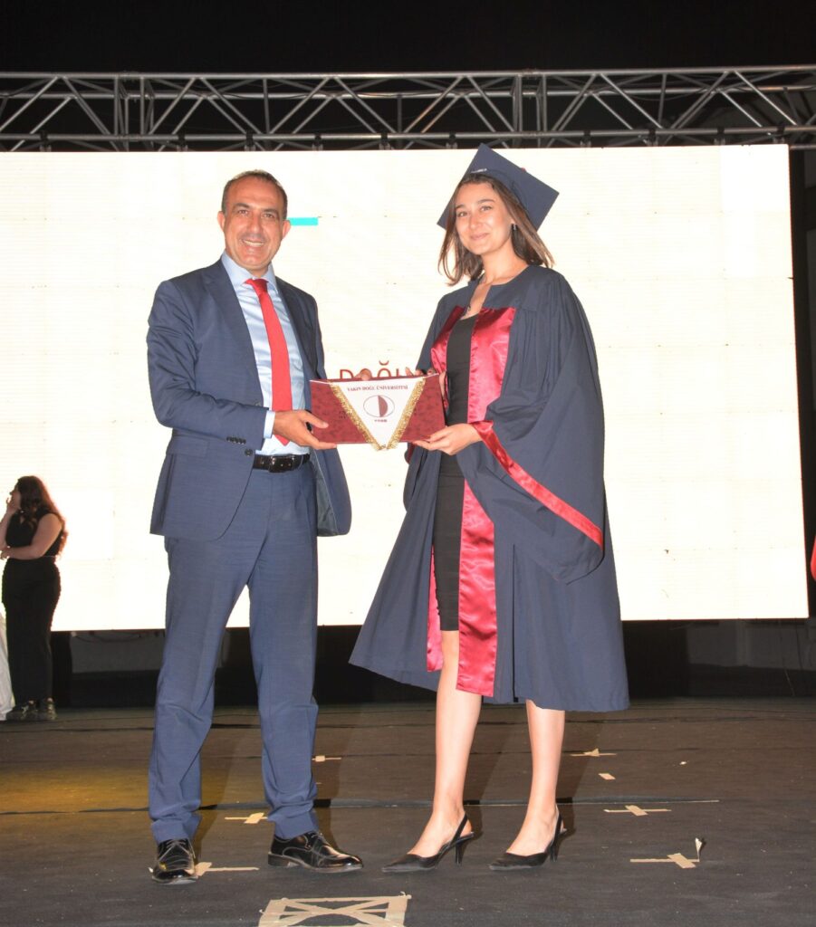 Kıbrıs Vakıflar İdaresi (EVKAF) Yönetim Kurulu Başkanı ve Kıbrıs Türk Tütün Endüstrisi Genel Müdürü Selahaddin Bayırkan da yüksek lisans eğitimini tamamlayan kızı Aksanur Bayırkan’a diplomasını takdim etti.